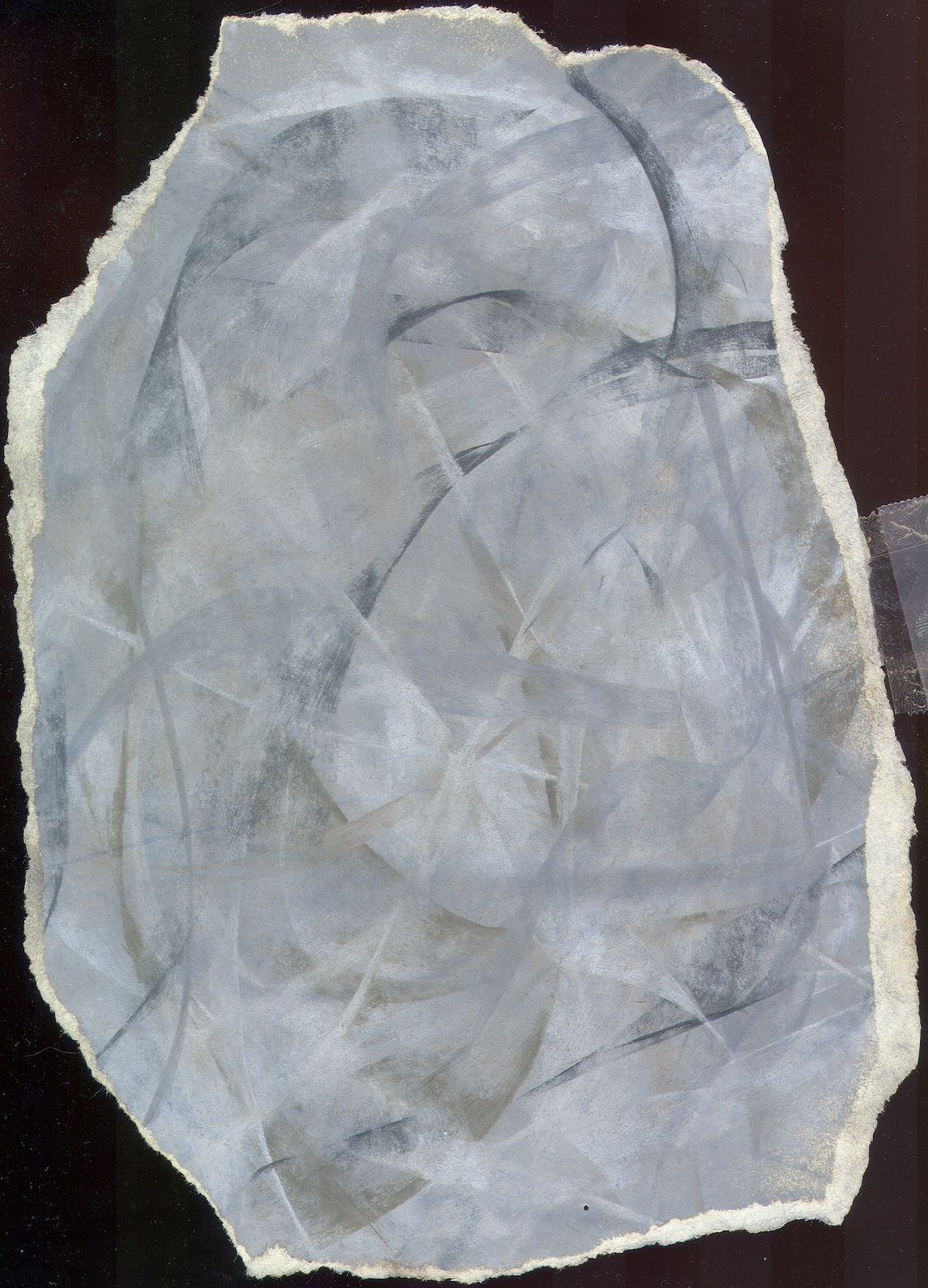 The full view of Gray Bursts. I don't use frames when I hang my drawings, I just use blue tack. (I used to use scotch tape, which you can see here.) Framed they feel a bit more removed from the things I actually made, a little less real. Similarly, when I make them I often paper from around the pastel-heavy area, exposing the paper grain. I included those ragged edges in this photo. These measures heighten the contrast between the medium and the drawn image. For me, these measures make the images seem more pronounced, more substantial.